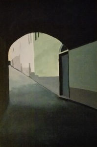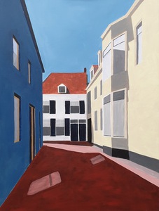 2022De St. Jan bestaat 800 jaar, reden voor een schilderij. Vanuit een prachtig straatje gezien. Dit schilderij was in september 2022 te zien in de St. Jan in Den Bosch.
