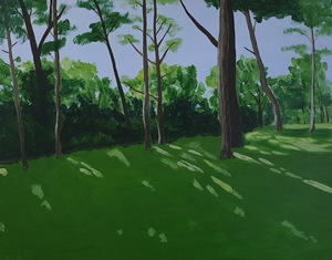 2020De zon die lichte vlekken strooit over het gazon. Zomer. Acryl op karton.