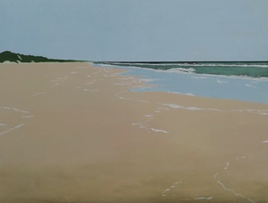 Prachtig is het aan zee, altijd. Hier schilder ik het verre water en de fijne witte schuimlijntjes op het zand. Acryl op karton, ingelijst.